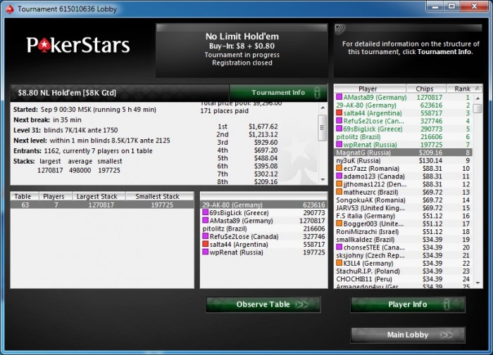 Последние дни складывались неплохо, было меньше переездов чем обычно, но они попрежнему были. И как результат этого обидное 22 место к биге за 55(два коина подряд проиграл), в турбо кнокауте по 13.50 18 место (опять коин), в турбине по 16.50 9 место (перед финалкой проиграл коин и на финалку зашел предпоследним и монетка упала не в мою пользу А6<QTo). Сегодня в ребайнике по 11 после начала зоны итм стала заходить неплохо рука, но как говориться как пришло, так и ушло. в топ 50 шел 4-5-ым и карты умерли вообще., в итоге только 18 место.