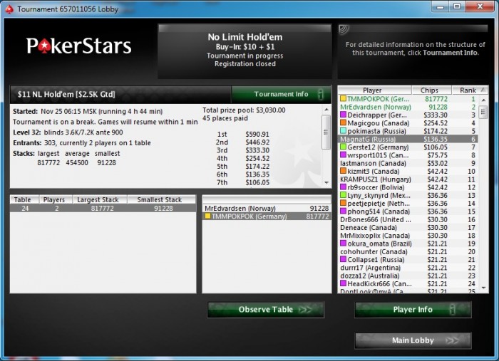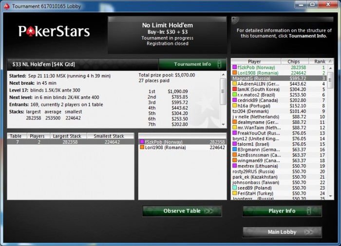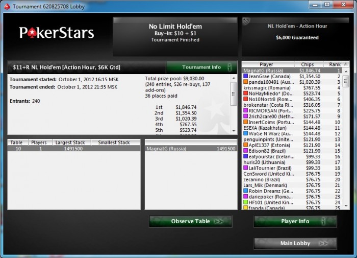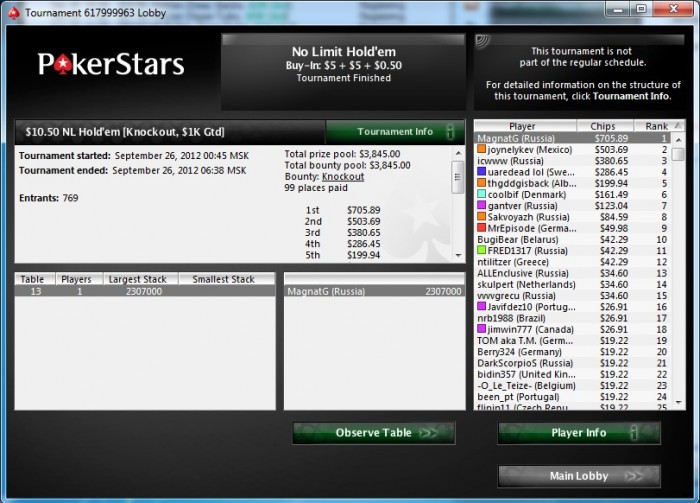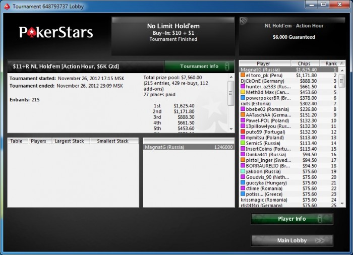 После этого добрался до финалки в кнокауте по 10.50, с самым коротким стеком, но в нем хорошая структура и оппоненты не самые сильные. Единственый кто меня раздражал своей везучестью так это Uareadead lol, но и он пал от моей руки. В итоге небольшие призовые, но приятное топ 1.