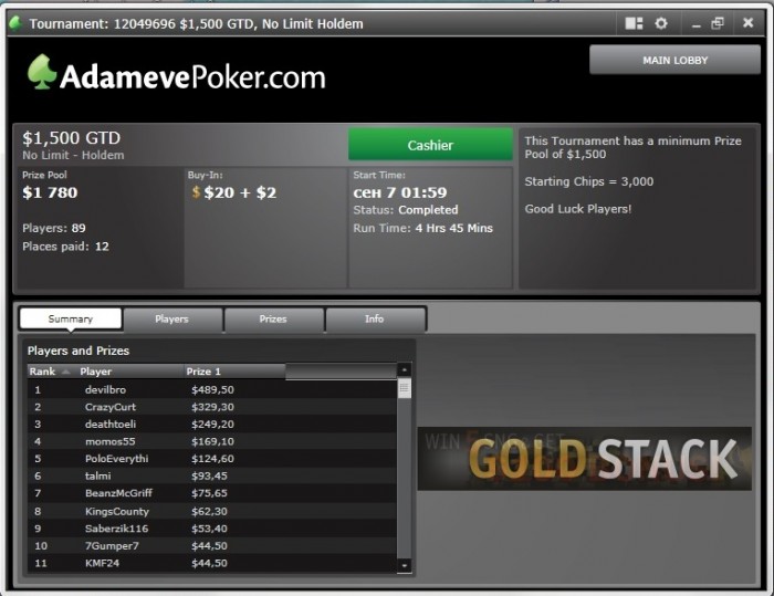 В это время в турнире остается около 2к игроков, призы примерно с 1000, зарегалось около 10к.
