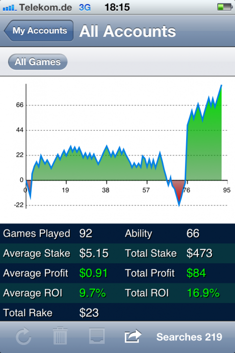 Сыграл около 300 турниров, пока в очень слабый плюс. Так как времени не очень много для игры, то, наверное, даже 1000 турниров за месяц сыграть не успею. Сначала играл только обычные турбо турниры по 7$, а потом перешёл на шутауты на 4х человек, так как они, на мой взгляд, более выгодны. В общем, за это время, что я это всё играл, я заработал крайне мало и ещё меньше заработал бонусных очков - если бы я играл столько же времени в 6 мах кеш, то всё было бы более радужно.