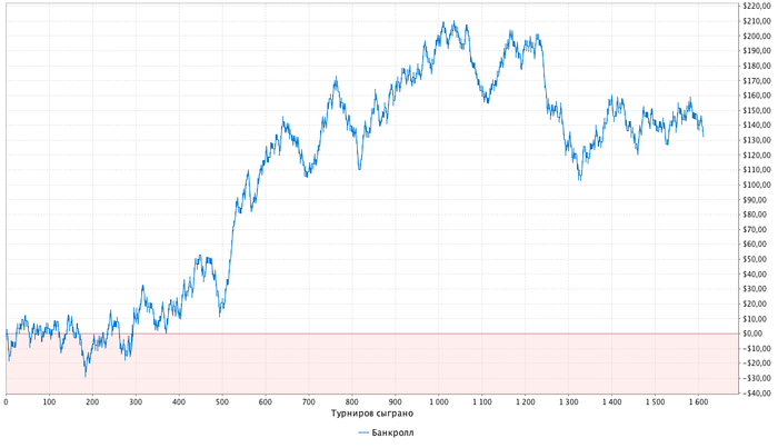 Так я даже не смогу сохранить статус Gold в этом месяце. Ну и стрики в 100 турниров в ноль и по 10 турниров подряд в минус - при адекватной игре и таких переездах, что становится смешно - это как-то уж слишком сурово. Наверное, лучше буду сейчас играть 6 мах кеш на 6-9 столах - это, судя по моему опыту, для меня больше подходит. Но игра крутая, думаю, что когда БР будет позволять, то попробую себя в СТ ХА снг c лимита 30$ - так как книги и живые примеры говорят о том, что можно многого достичь в этой дисциплине. Посоветуйте, на ваш взгляд, я к правильным выводам пришёл? Ведь 20 турниров в день со слабым ROI и никакими бонусами - это не очень круто, так ведь?
