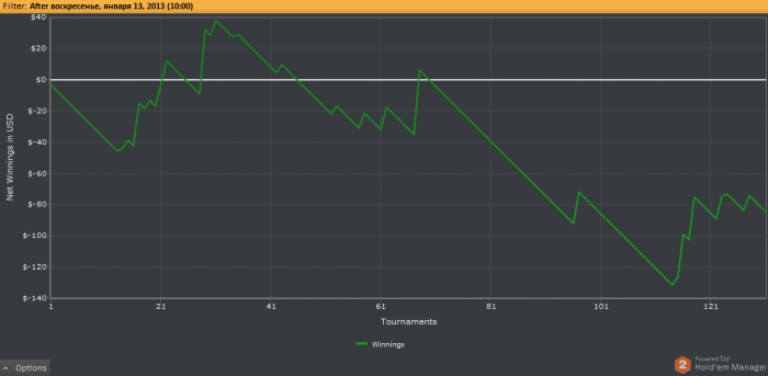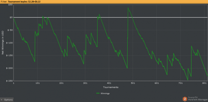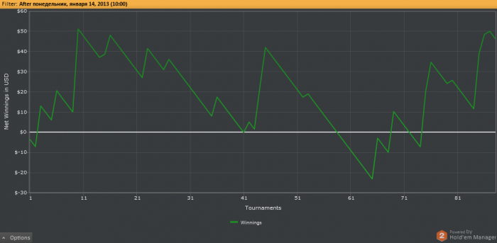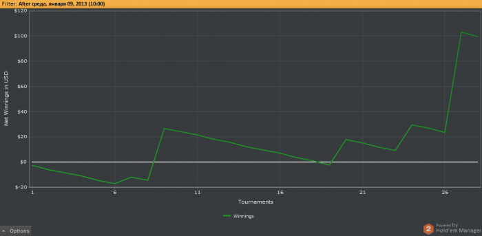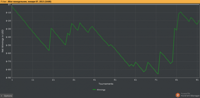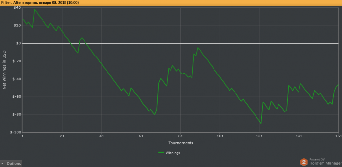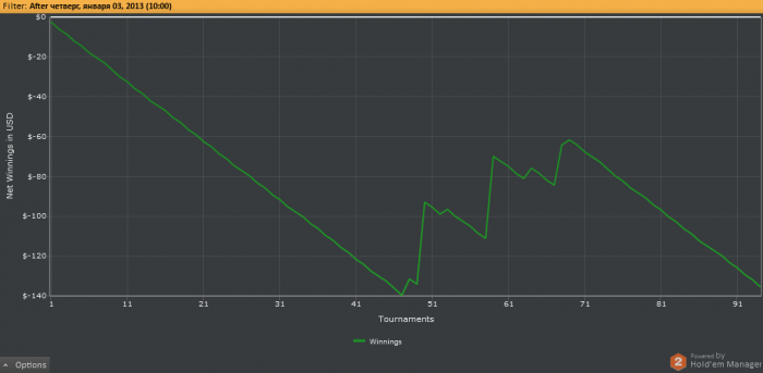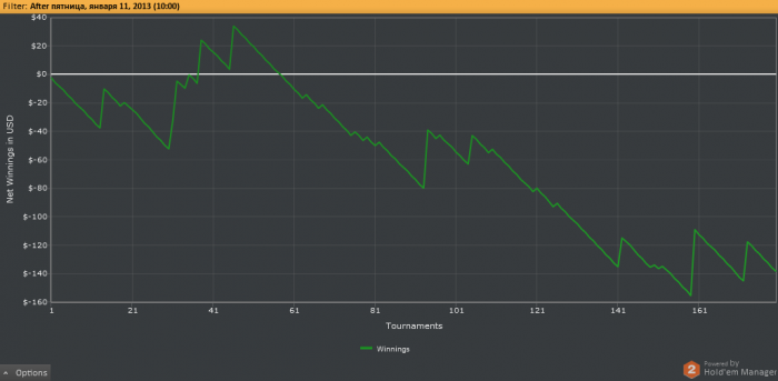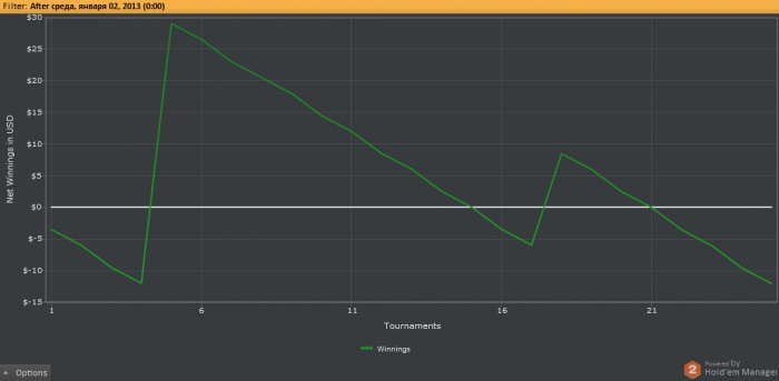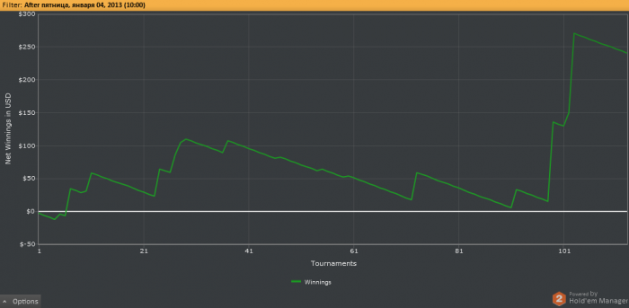 Дальше о режиме катки. Да я понимаю что по 100 турбо турниров в день, а то и меньше - это очень слабо. Как я уже и говорил я щас еще праздничном настроении, хочется развлекаться и т. д. Планирую нормальным гриндом заняться после 10го января примерно. Так же мешает конечно очень маленький банкрол. Играю с АБИ 3$ щас турниры и получается около 200 бай-инов в банкроле. Это конечно же маловато. И часто я не гружу новые столы, когда сессия проходит не очень удачно. Я думаю если щас не удастся вывести хотя бы в 0 эту сессию - то придется играть более дешевые турниры. И таким образом играю только 5-10 оставшихся турниров много времени.