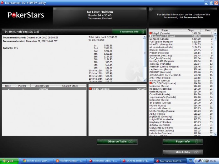 MP1 D.Brylant (2,140) 27bb MP2 masurpilami (8,550) 107bb MP3 vanb11 (1,460) 18bb CO kokosevich (11,510) 144bb BTN Kamelion13 (6,070) 76bb SB indofson (