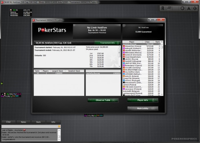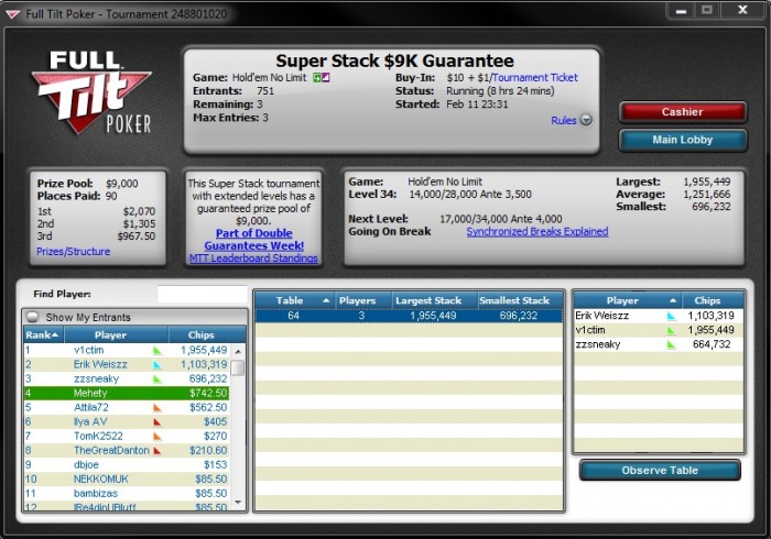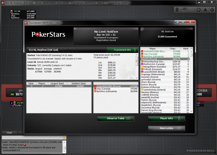 Пиздец какой-то! Отсидел десятичасовую сессию, сел за финалку в кепке за $5,5, сразу же сдали АА и успешно их переехали. Нахуй так жить-то! Просто связали по рукам и ногам и жестоко отпинали, забрав казалось бы гарантированный топ 3, проведя по губам девятым местом :(