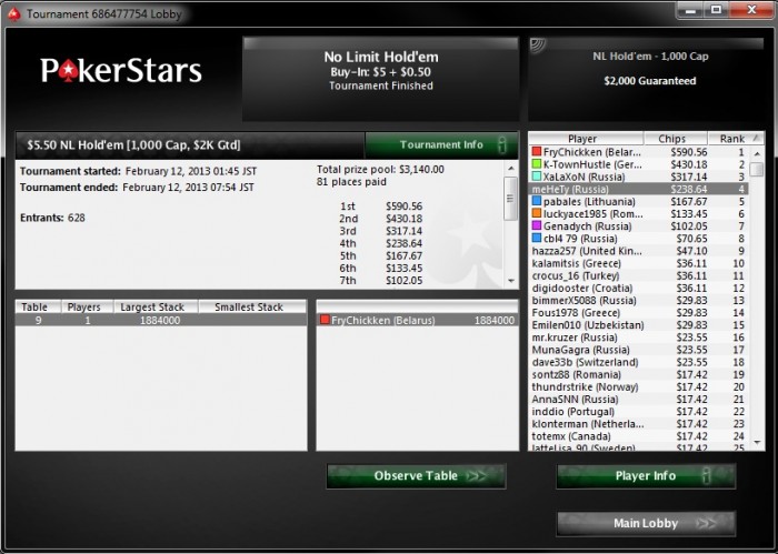 Ну а поскольку совершенно нечего постить в дневнике, буду постить хоть такие результаты. Финальный стол был на редкоть отвратительным. За все время только единожды сдали , где я просрал практически весь стек и последняя раздача с вперся Задолбался мимо нормальных призов проходить. Топ 4 всего лишь поправил банкролл. Хотя прикольно пересидел половину стола с коротким стеком :D