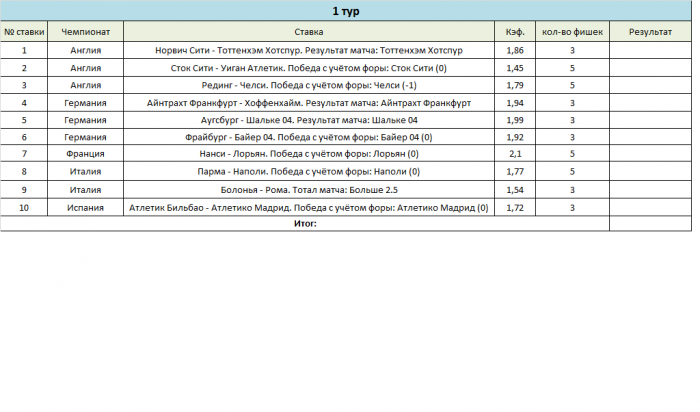Если Женя не против, я отпишусь - я один из участников турнира. Не скажу, что я супер-авторитетный человек на форуме, но вроде в косяках и словоблудии не замечен. Турнир действительно есть, в нём участвуют реальные люди(по-крайней мере я знаю троих, которые не боты). Как будет вестись статистика и прочее - внутреннее дело команды и организатора турнира. Думаю, что Женя сам решит, как это будет выглядеть. По поводу своих ставок - даже не против, чтобы их выкладывали на всеобщее обозрение - лично мне скрывать нечего - никаких обязательств по поводу РОИ и прочего у меня нет. Аргументировать ставки в принципе могу, но не считаю нужным. Пока для меня это пробный шар, скепсис всех недовольных мне немного непонятен, но это сугубо личное дело каждого. Просьба одна - трольте по существу, а не ради троллинга.