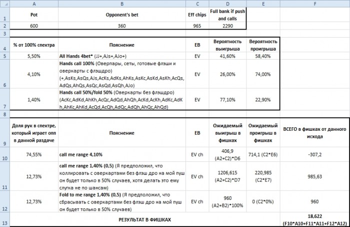Когда оппонент делает 4бет размером 2х, он дает мне пот оддсы равные 25%, а префлоп я стою против его диапазона (исключая блефы):