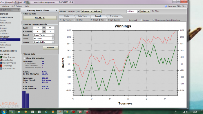 Возможно у тебя HM1 считает только последний All in, в котором оба выставились. В Data View посмотри турнир, где было много выставлений. К примеру, вы выставились до ривера, враг выиграл. У тебя осталось 50 фишек - ты олын, он кол. Проверь последнюю руку по формуле: $EV Won = $ Won - $EV Diff. Если сошлось, значит точно считает только последний алын. Возможно как раз по этому EV и строится график.