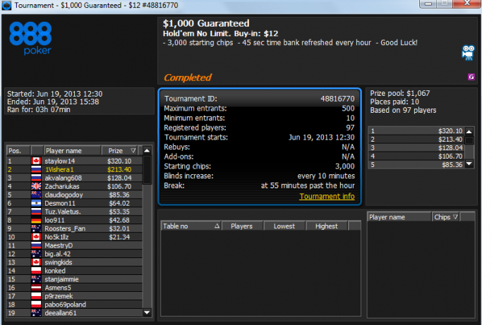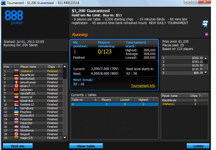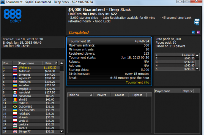 мда, очень жаль. шансы вроде были, и стеки были, но увы. топ 100 и топ 130 на старзах, не доехал. JJ<AA в одном, и QQ<AK в другом. и старзы отправили меня спать) лаадно, может завтра доеду)) играем в минус, но смотрим на будущее с улыбкой=)