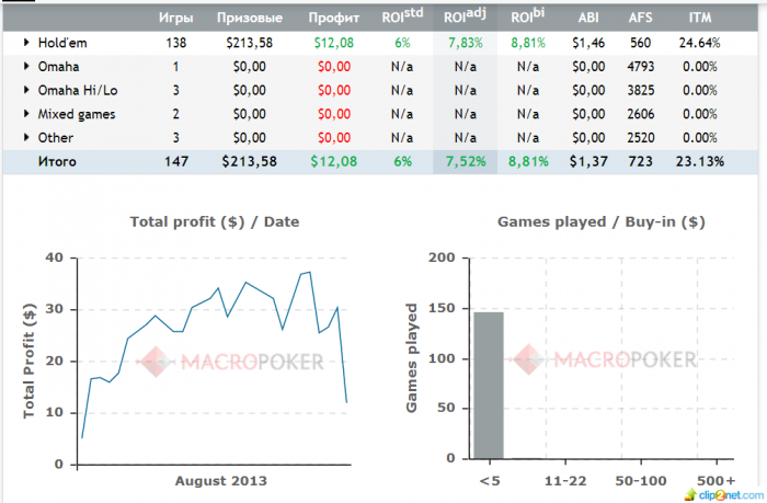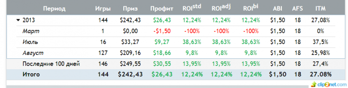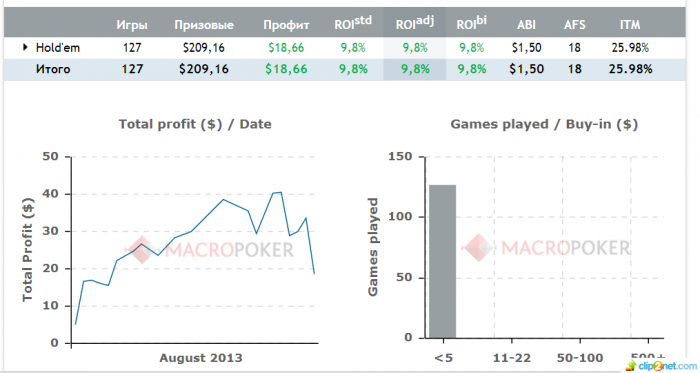 Напоследок же, хотелось бы взглянуть на график моего движения по турнирам СНГ 18max за 1.5$ по месяцам 2013 года Да, дистанция ещё не такая большая, но хочется верить, что после разбора своих ошибок месяц сентябрь будет не только прибыльным в плане роста профита, но и улучшатся все остальные показатели, а главное - качество и уровень игры
