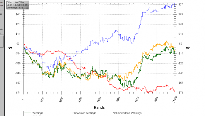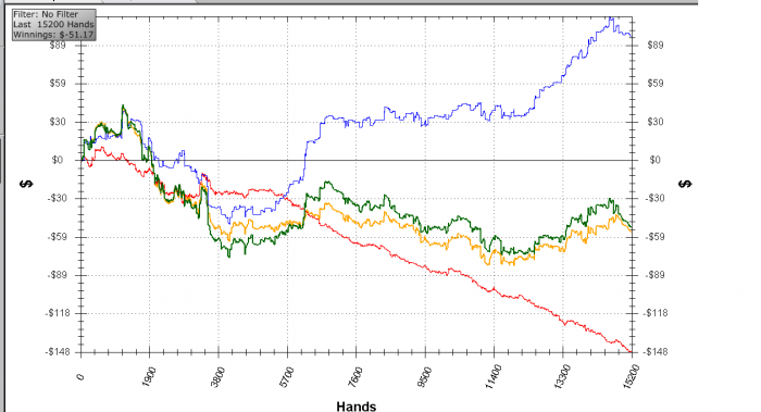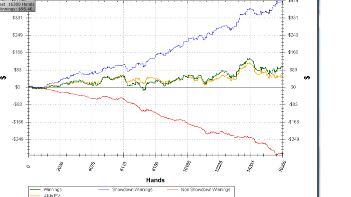 Заметь, сайзинг флопа и терна существенно отличается. Если на флопе он ставил пол-пота, желая оставить обоих в раздаче (несмотря на ФД),то на терне и ривере жарит по 80%. ИМХО, там не слабая рука, учитывая WTSD 17%