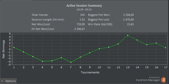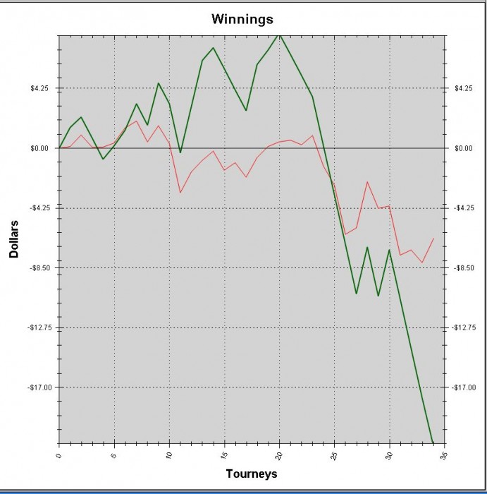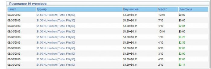 Доброго времени суток форумчане! Я наконец таки взял свои яйца в кулак и начал катать дальше. Что касается сегодняшнего дня, то я доволен. Плюсанул около 10$. Поле как и всегда слабое, однако и без переездов не обошлось. За сегодняшний день сдали 5 раз , однако ни разу я с ними не выиграл. Однако не суть… Несмотря на переезды, я доволен своей игрой, ведь знаю, что играл практический без ошибок. Еще кое-что прикольное сегодня было, большинство регов на моем лимите творили нечто невероятное, показывали слабую игру. Из последнего, что запомнил, это пуш рега с 22 (стэк 20 ББ) при блинах 50/100 причем с утг и это не единственный случай. Ну а фиши как всегда в своем репертуаре. Решил сегодня сесть катать за ноутбук и поэтому график только вечерней сессии, где плюсанул около 2$ всего лишь… Завтра продолжу в том же духе. Всем успехов !