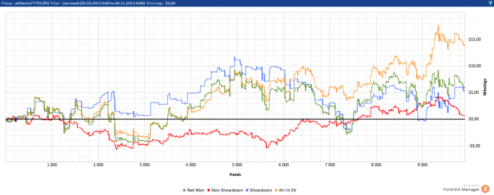 Доброе утро.Хотя не очень оно и доброе.Отчет за прошедшую неделю.Мне так и не удалось достичь какого то большого прогресса.Из поставленных мною целей удается, выполнять только одну - это просмотр ВОД'ов Korsic'a.Точнее одного видео,а именно 4й части КМБ.Основная работа не даёт особо много заниматься и играть.По этому результаты плачевны.Ну ничего я не отчаиваюсь и верю что рано или поздно у меня всё получиться. Конкретно по игре.Мне нужно серьезно поработать над определением диапазона соперника.Если кто знает какие нибудь стать или видео на эту тему буду признателен. Ещё возник вопрос о розыгрыше на микролимитах. Например мы в CO с опп с MP делает опен рейз мы 3бет нас 4бетят есть ли фолд против неизвестного? Итак график за прошедшую неделю выглядит так И несколько раздач.Все три раздачи сыграны с неизвестными оппами. PokerStars No-Limit Hold'em, $0.02 BB (6 игроков) - PokerStars Converter Tool from http://www.flopturnriver.com