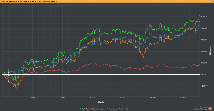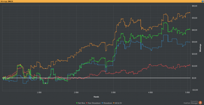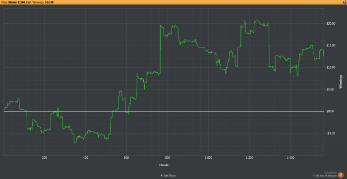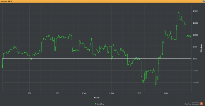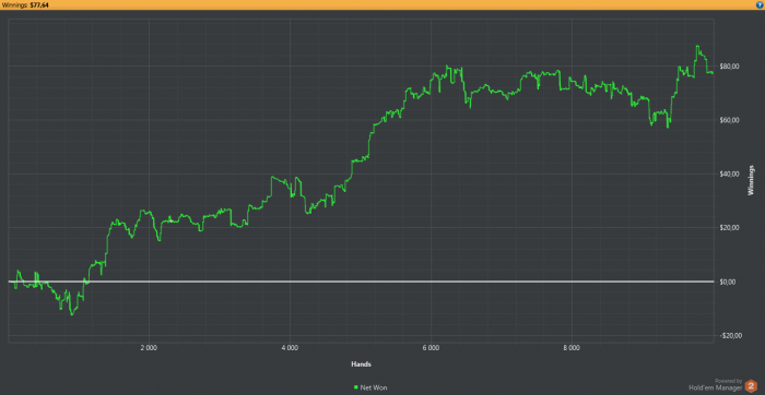 Катнул первую сессию на НЛ10. Поделюсь впечатлениями. Во-первых, люди более агрессивно играют префлоп, замечал даже за блеф 4бетами, но не очень умело (против неизвестного опа типа меня это дорогое удовольствие). Во-вторых реже падают на постфлопе, видел флоаты на воздухе. В остальном все тот-же НЛ5. Все как-то сильно палятся бетсайзингом как на префлопе так и на следующих улицах. График: