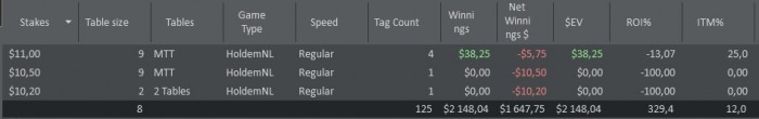 Откатал очередную микро МТТ сессию, сыграно 12 турниров из них 3 ИТМ, 2 достаточно глубоких: 169 из 11К участников и 99 из 3800 уч., в обоих шел с отличными стеками, очень обидно раздавали всю дорогу.