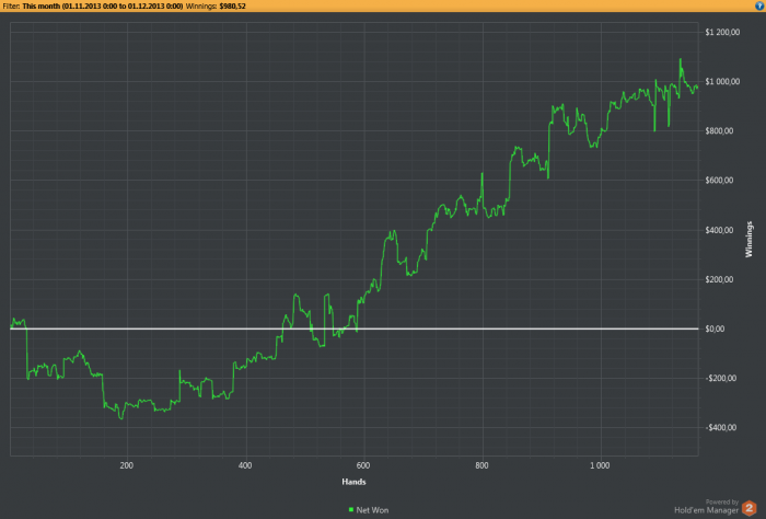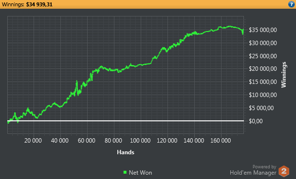 Кстати, для потенциальных бэкеров график с начала года (лимиты 200-400 и немного 100, 50\50 6макс и ху). Сюда не вошли руки которые играл с чужих акков и плоХА, там еще около 5К профита.