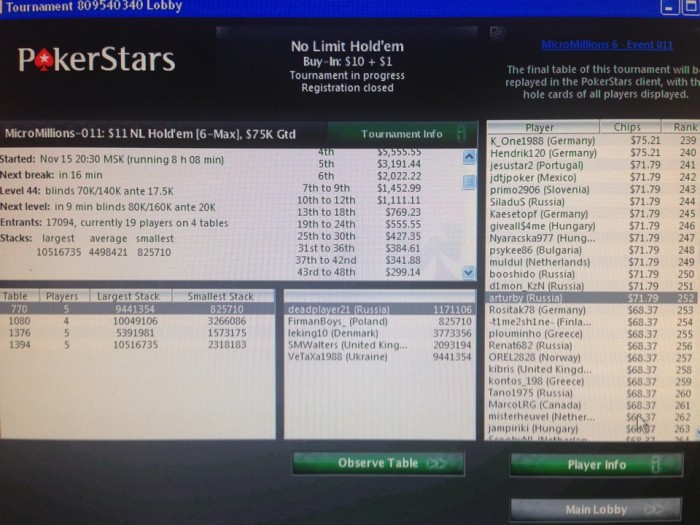 Маркетологи старзов сделали свое дело, я с горящими глазами и с желанием стать милионером зарегился в Sunday Million с 5m гарантией, которая по итогу была уменьшина ,наверно из-за недобора таких же страждующих... Вообщем , пацан не смог продвинутся к успеху. На самом деле играл я этот турик чисто фофан уже раз 7ой ,при этом пока ниразу не добирался до бабла, думал мож хоть сейчас)).... В целом играл я на этой и прошлой неделе немного, постоянно в каких то делах, посетил несколько собеседований, приняли меня в Росгосстрах, но я вежливо отказался т.к. Надежда < реальность, обещали одно получилось другое... Вообщем продолжаю искать работу и чесно скажу уже заебался ездить по собеседованиям... Помимо вышеописанного негатива, есть и немного позитива, был дипран в турбине за 11$ там почти добрался до финального стола плюсанул около 50$, и занял 3/90 в Big ante за 22$ = 250$, вообщем отыграл потери в SM, что касаемо рег.дисциплины дела здесь идут так себе, ROI минимальный