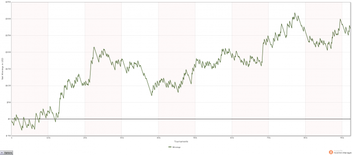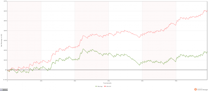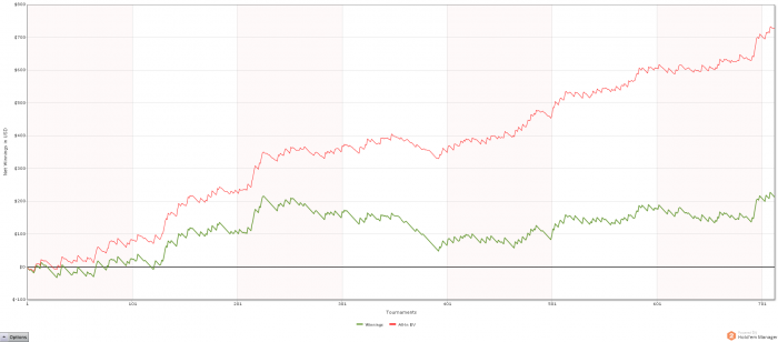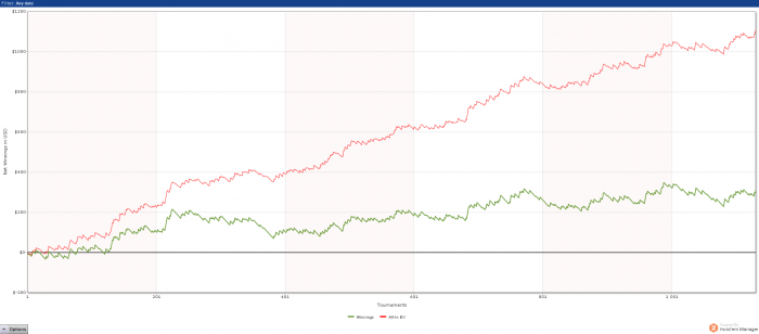 Получилось за 1к турниров ROI - 9%, для этого лимита оно минимально, но с учетом моей недодачи вполне неплохое...