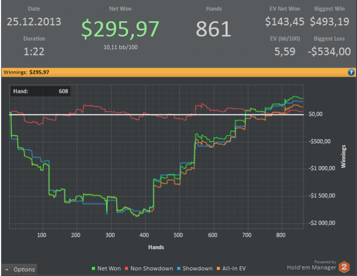 Цели думать про цели на 2014 год мне пока лень, да и ставить цели на год без промежуточных не слишком продуктивно, так что напишу про цели на Январь. 1. Достич прогресса в в плане фолдов ривера во время тильта.(следующий пункт количественно отражает этот) 2. Залить на очевидных для меня ошибках не больше 2бб/100(цель максимум), для этого нужно искоренить подсознательное желание выигрвать поты в пользу желания делать максимум +ЕВ решения. 3. откатать 80к+ рук( 120 часов), цель максимум откатать 110к рук(165 часов) 4. если пункт 3 будет перевыполнен на этапе 2-3 недели + будет показан хороший профит+ будут выполнены пункты 1 и2 - тогда отказываюсь от довыполнения пункта 3 в пользу перехода закрепления на нл400 с селектом.