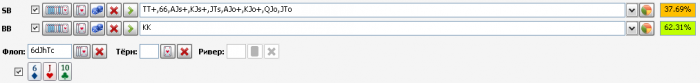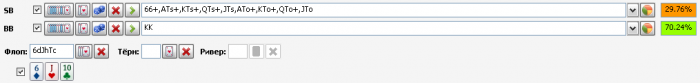 Я выставил в диапазоне колла префлоп (с учетом 3бета флопа) KQs ТТ-KK и 66. Можно также добавить AJ, JTs