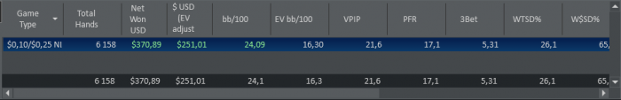 SB: $26.13 - VPIP: 22, PFR: 18, 3B: 6, AF: 3,4, Hands: 506