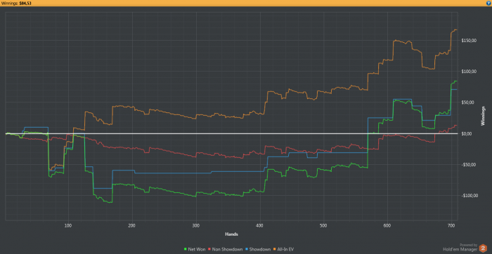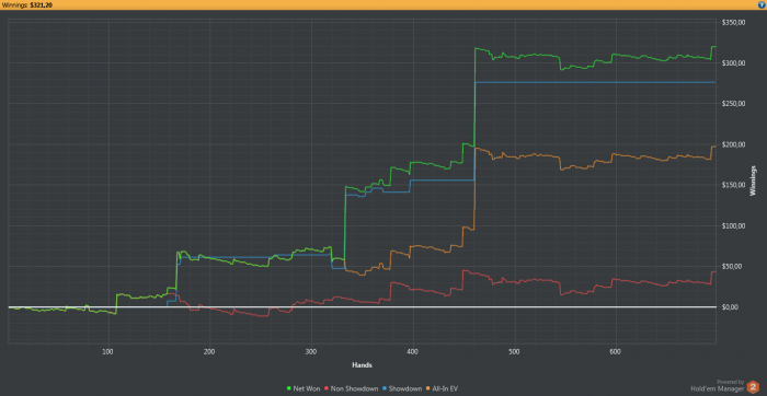 Сегодняшний день получился таким hands 698. 13/11/6 +321$ в принципе ничего не изобретал. один раз в префлоп оллине сложилось мои АК убили ВВ. в целом даже ничего интересного и не было.