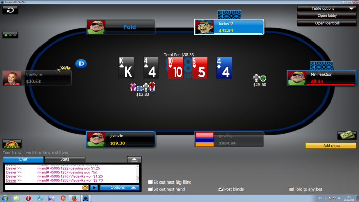3. Лучший рег лимита против худшего. Только щас я понимаю на сколько минусовый кол я сделал. Я бью только две руки, которые он превращет в блеф. И проигрываю всем велью рукам22-JJ которые он так же мог запушить.