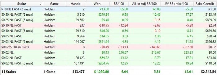 Мало играл и вообще, такой график меня в корне не устраивает. Сегодня играл полные столы, по первому впечатлению, винрейт должен быть выше, нежели на SH столах.