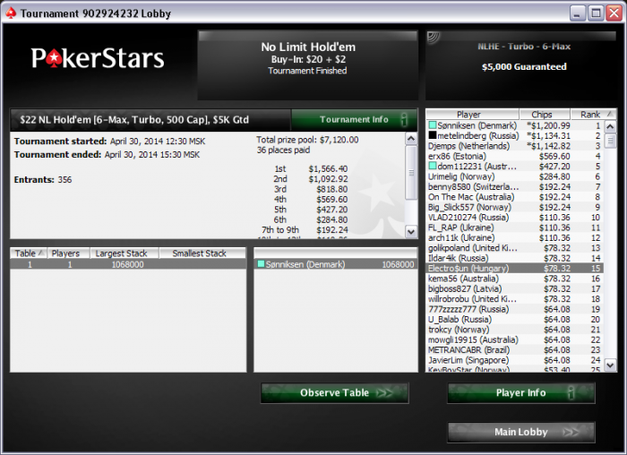 Poker Stars $15.00+$1.50 No Limit Hold'em Tournament - t600/t1200 Blinds + t125 - 9 players -