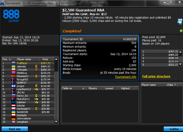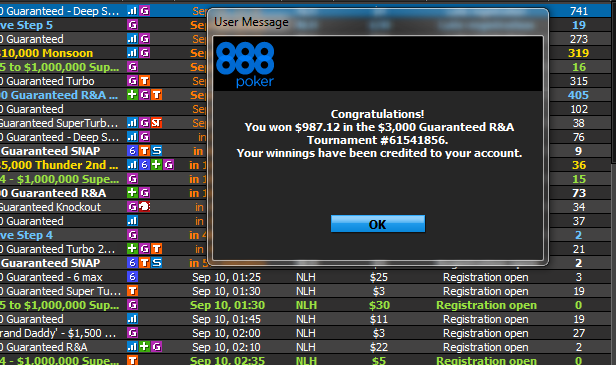 И так привет народ! снова отчеты, снова покер)) Сентябрь встретил меня хорошо и продолжает радовать) на волне апстрика продолжаю тащить на 888, ну а старзы по прежнему... Вчера отыграл в небольшой +. А сегодня был день финалок, был на 3 финалках, в одной вылетел где то 7, в другой 4 и 1 удалось втащить))