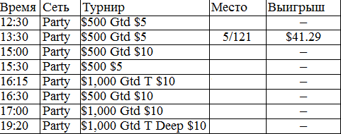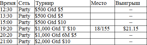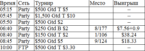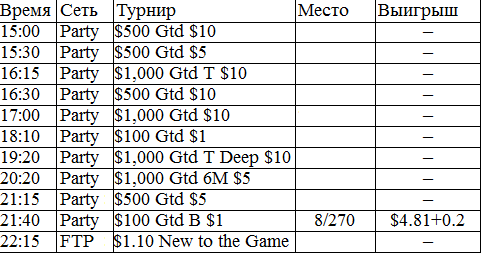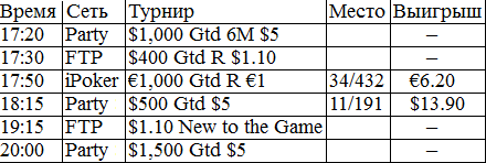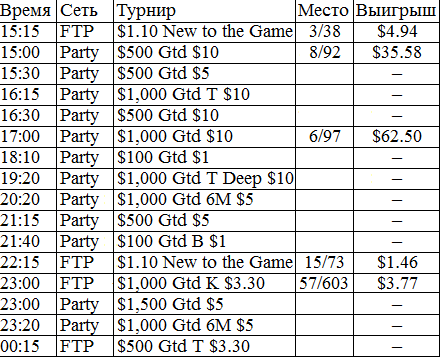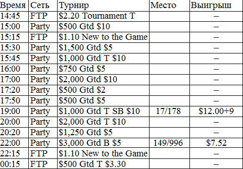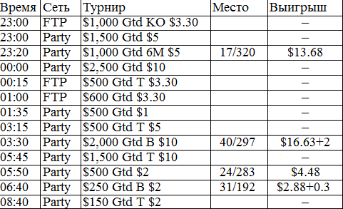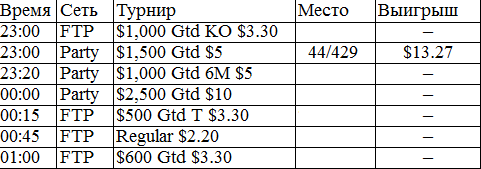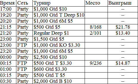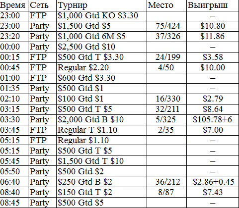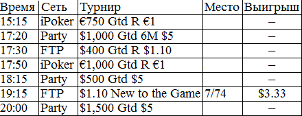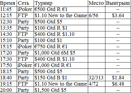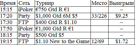У меня никогда в жизни не было столь длительного перерыва в игре. В этом месяце было немного не до покера, зато теперь начинается настоящий гринд. Думаю, с этого всё и начнётся, во всех смыслах этого слова. Поставил на вывод все деньги из iPoker'a, буду играть на двух румах: Party и FTP. Как только придут деньги из айПокера, закину их на ФТП и буду подключать уже нормальные фризы за 5 бакинских. Ну ладно, вот отчёт за сегодняшний вступительный день.