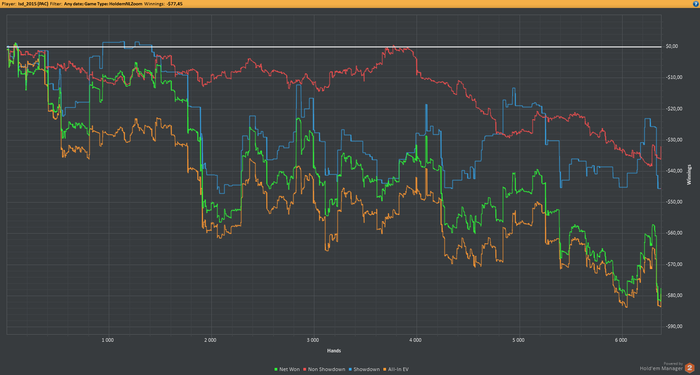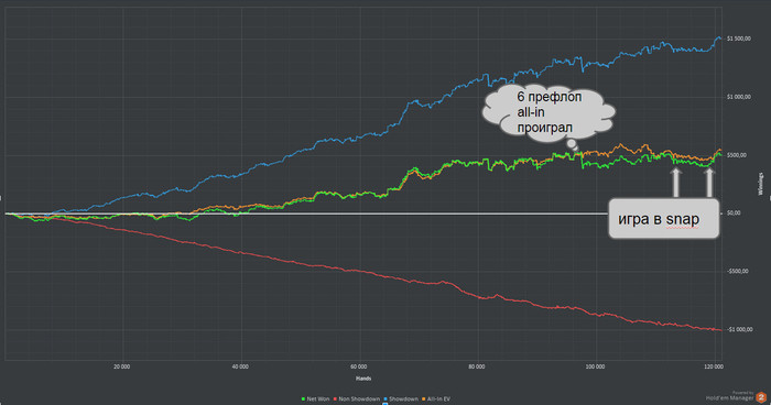 Кстати, как видно на графике оранжевая линия (all-in EV) которая у меня разьехалась с зеленой линие (реальные деньги) когда я за одну сессию проиграл 6 префлоп алынов будучи старше потом порравнялась с зеленой. Вот это и называется "ГСЧ вернул".