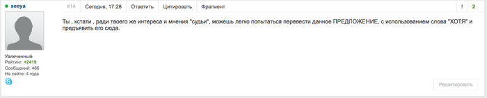 seeya @ 31.8.2014 Ты , кстати , ради твоего же интереса и мнения "судьи", можешь легко попытаться перевести данное ПРЕДЛОЖЕНИЕ, с использованием слова "ХОТЯ" и предъявить его сюда.