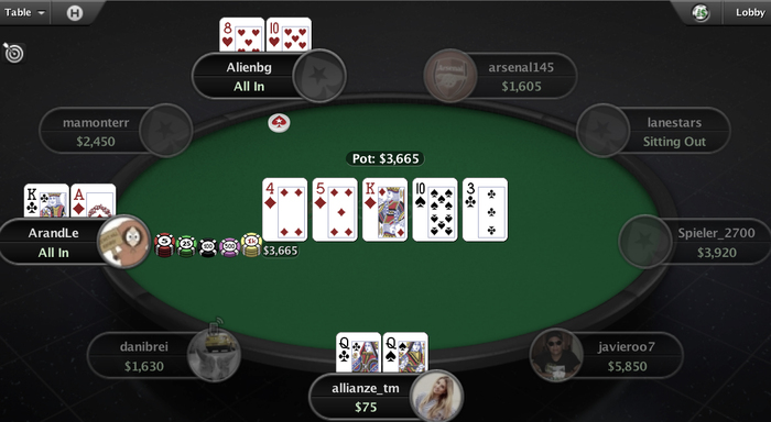 Но то были еще цветочки. Затем мне ударила моча в голову и я едва не обоссался, пришлось выставиться с двусторонкой на флопе против пары шестерок. Недоехал и ушел в ситаут звать ихтиандра. Вернулся: мама дорогая, да у меня же 7ББ осталось! Пришлось срочно включать режим "пьяный Филатов". А3 пихнул - украл блайнды, опять пихнул А3 против А8 - поймал тройку, удвоился - уже 15ББ.