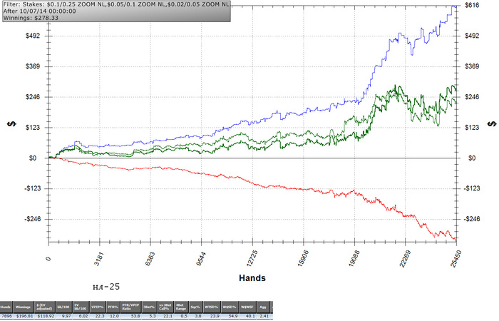 UTG: $25.00 - VPIP: 7, PFR: 5, 3B: 1, AF: Infinity, Hands: 230