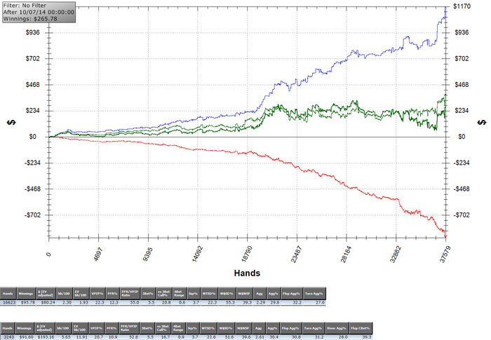 SB: $52.11 - VPIP: 16, PFR: 10, 3B: 4, AF: 1.8, Hands: 297BB: $32.78 - VPIP: 11, PFR: 8, 3B: 4, AF: 2.3, Hands: 7013