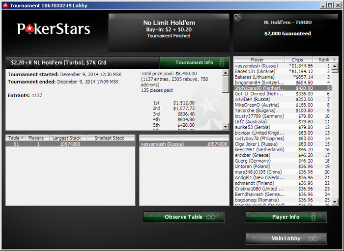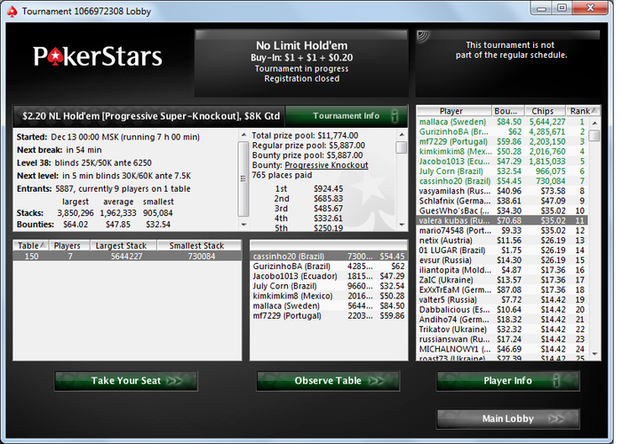 Poker Stars $1.00+$1.00+$0.20 No Limit Hold'em Tournament - t25000/t50000 Blinds + t6250 - 8 players