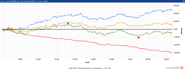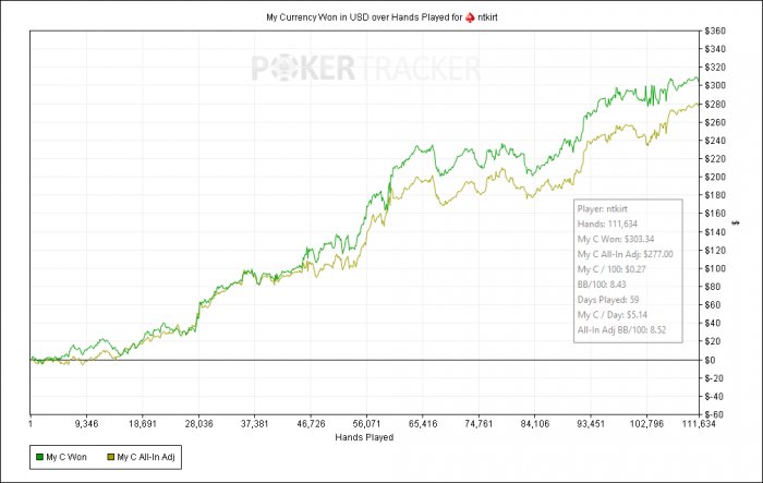Всем привет, меня зовут Александр, мне 20 лет. Играю лимиты НЛ2-НЛ10. В сумме отыграл уже около 300 тысяч рук на этих лимитах. Несколько раз выводил деньги и начинал играть снова, на этот раз хочу подниматься вверх долго и упорно, благо с финансами стало более-менее хорошо. Вот небольшая часть графика
