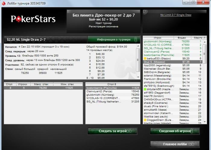 PokerStars Раздача №48644728703: Лоуболл 2-7 с тройным обменом Лимит ($0.50/$1.00 USD) - 25.08.2010 16:41:26 MSK [25.08.2010 8:41:26 ВВ] Стол 'Persephone' 6-max Баттон на месте №5 Место 1: Farok1 ($19) Место 2: slavaparfyum ($42.20) Место 3: Druz S. ($6.55) Место 5: komisz ($16.95) Место 6: erfigo ($16) erfigo: ставит малый блайнд $0.25 Farok1: ставит большой блайнд $0.50 *** СДАЧА КАРТ *** Карты Druz S. [Td Ts 5d 2h 9d] slavaparfyum: делает фолд Druz S.: делает рейз $0.50 $1 komisz: делает фолд erfigo: делает колл $0.75 Farok1: делает колл $0.50 *** ПЕРВЫЙ ОБМЕН *** erfigo: сбрасывает 2 карты Farok1: сбрасывает 3 карты Druz S.: сбрасывает 3 карты [Td Ts 9d] Карты Druz S. [5d 2h] [7s 6s 7d] erfigo: делает бет $0.50 Farok1: делает фолд Druz S.: делает рейз $0.50 $1 erfigo: делает рейз $0.50 $1.50 Druz S.: делает колл $0.50 *** ВТОРОЙ ОБМЕН *** erfigo: сбрасывает 1 карта Druz S.: сбрасывает 1 карта [7d] Карты Druz S. [5d 2h 7s 6s] [As] erfigo: делает бет $1 Druz S.: делает колл $1 *** ТРЕТИЙ ОБМЕН *** erfigo: сбрасывает 1 карта Druz S.: сбрасывает 1 карта [As] Карты Druz S. [5d 2h 7s 6s] [4d] erfigo: делает бет $1 Druz S.: делает рейз $1 $2 erfigo: делает рейз $1 $3 Druz S.: делает рейз $0.05 $3.05 и олл-ин достигнут лимит ставок erfigo: делает колл $0.05 *** ВСКРЫТИЕ КАРТ *** Druz S.: открывает [7s 6s 5d 2h 4d] (Лоу: 7,6,5,4,2) erfigo: открывает [4s 7c 3s 2d 5c] (Лоу: 7,5,4,3,2) erfigo получил $13.60 из банка *** ИТОГ *** Общий банк $14.10 | Доля $0.50 Место 1: Farok1 (большой блайнд) сделал фолд после 1й обмене(а) Место 2: slavaparfyum сделал фолд до обмене(а) (не ставил) Место 3: Druz S. открыл [7s 6s 5d 2h 4d] и проиграл , собрав Лоу: 7,6,5,4,2 Место 5: komisz (баттон) сделал фолд до обмене(а) (не ставил) Место 6: erfigo (малый блайнд) открыл [4s 7c 3s 2d 5c] и выиграл ($13.60) , собрав Лоу: 7,5,4,3,2