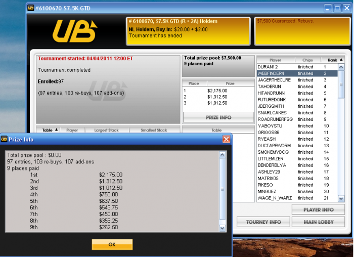 Апрель мою любимый месяц для катки. Вот уже второй год подряд это позитивно отражается на результатах. В том году было два заноса в килополях на старзах, в этом по скромненькому сделал профит в небольших покер румах (Titan i UltimateBet). Последний кстати был мой самый любимый, если бы не "черная пятница" и последствия после него, ни за что не покинул бы такое хорошие место. Теперь я поисках замены. Может быть кто нибудь посоветует куда можно податься бедному регуляру средних лимитов?