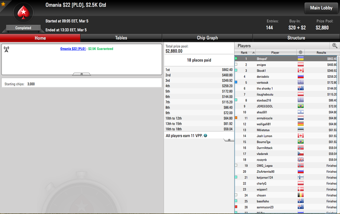По терну у меня было всего 23%, но это скорее кулерная ситуация. Я рассчитывал, что у меня лучшее лоу дро, и при лучшем лоу дро (как и должно было быть) свои 40 копеек я имел, что более чем достаточно для пуша. После этого я так не раскрутился и вылетел 15-м. Ему мой стек, правда, тоже не помог. Официально очередной недоезд.