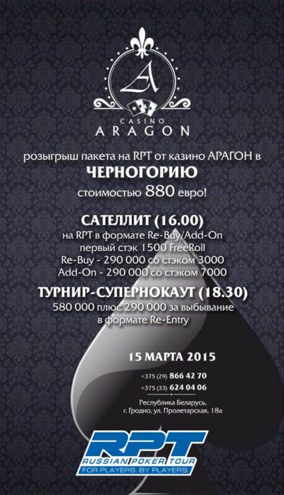 Дополнительную информацию можно уточнить у Гурина Дениса, генеральный менеджер покерного клуба «Aragon» (http://casino-aragon.by), +375(336)24-04-06 и +375(298)66-42-70 (мобильные).