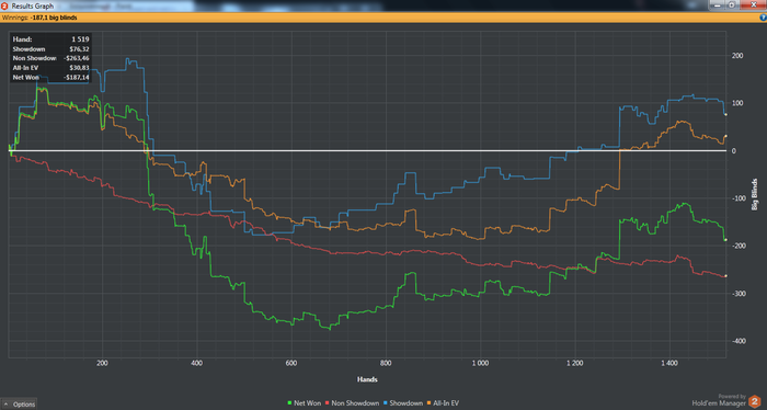 По графику из ХМ видно что много проигрывал не доходя до шоудауна, обычно у меня эта линия рядом с осью, ну и недодача 219 блайндов на 1500 рук...