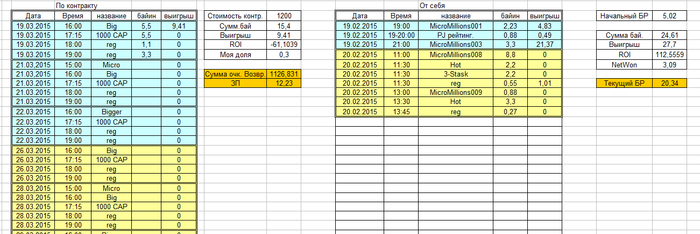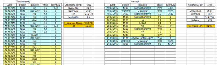 Так же теперь в нем выводится мой начальный банкролл(начиная с 19.03.2015), мой ROI от турниров, которые я играю от себя, и текущий банкролл( мои собственные средства на текущий момент). В текущем банкролле не учитываются средства, которые я должен потратить на турниры по контракту, но учитываются средства, которые я уже 100% должен получить по контракту (доля от выигрышей и ЗП по текущим результатам турниров).
