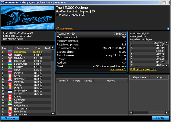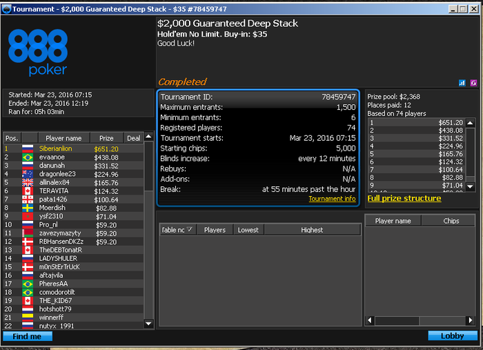 Давно не писали сюда! Расскажу как дела чуток.) Поменял график теперь начинаю работать с 2-00 МСК и гружу до 8 утра Из-за маленького афс количество итм и дипов большое!Это конечно приятно с точки зрения психологии!Сегодня например было 5 предфиналок и 2 финалки,но они все малышки и миллионов там нет) Одну малышку даже на топ-1 напинал сегодня Так что играю по факту снгхи и 5-6 турниров где афс больше 700 человек.Посмотрим что получится,но вставать в 5 утра а не в 4 дня мне уже больше нравится!)