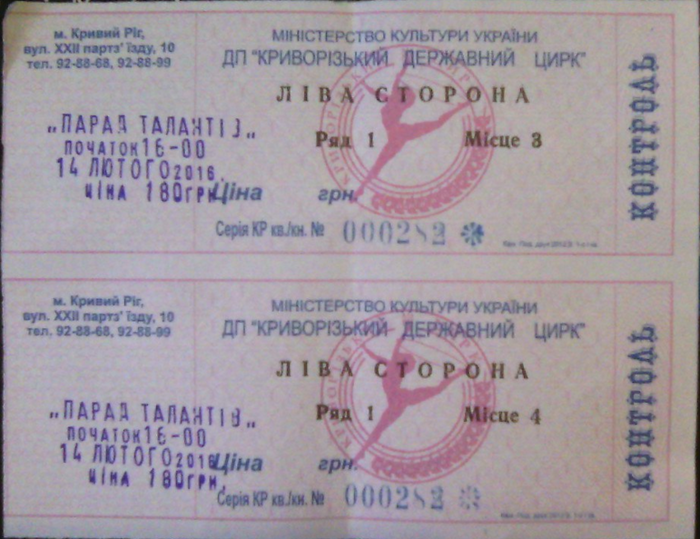 все нормальные пары 14 февраля ходят в кино, по барам, ресторанам....а мне жена заказала поход в цирк последний раз я там был около 15-17 лет назад..... кстати, за это время, внешний вид билетов вообще не изменился, только цена подросла в несколько десятков раз лишь бы на 8-е марта не получить заказ на поход в театр Ну, а сегодня, пойдем Дедпул смотреть, так разрекламировали его, посмотрим что там америкосы наснимали