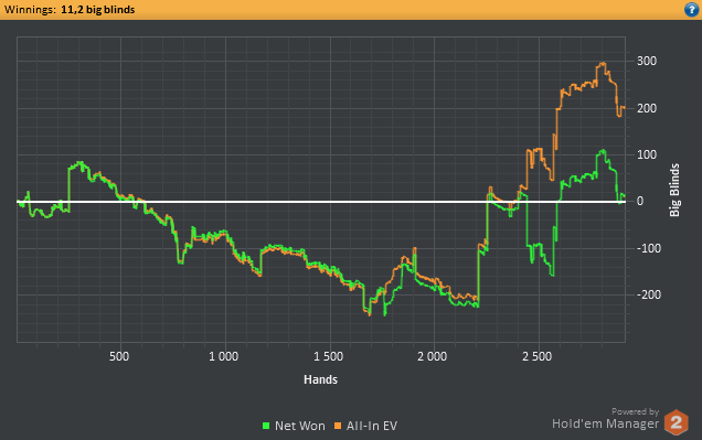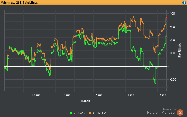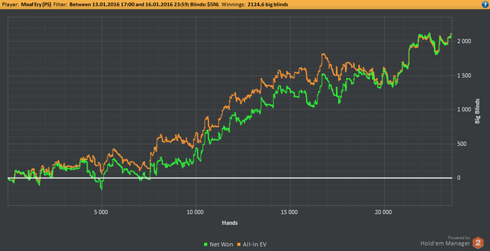 Думаю замутить небольшой нон-стоп марафончик. Надо покатать плотненько, тип 3 дня по 8 часов. Что то вроде этого. Вот сегодня как раз режим восстанавливаю до конца. Сейчас через 30 минут спать пойду и поставлю все таки будильник, а то блин опять 10+ часов посплю, просплю все нахер)) Если завтра желание бурное разыграется, то сяду катать нл5 нон-стоп 16(возможно 18) столов. Цель будет 24-30 часов. Это примерно 1500*24 = 36,000 рук. 1500*30 = 45,000 рук.