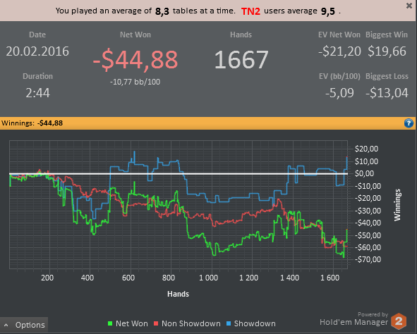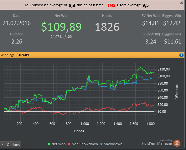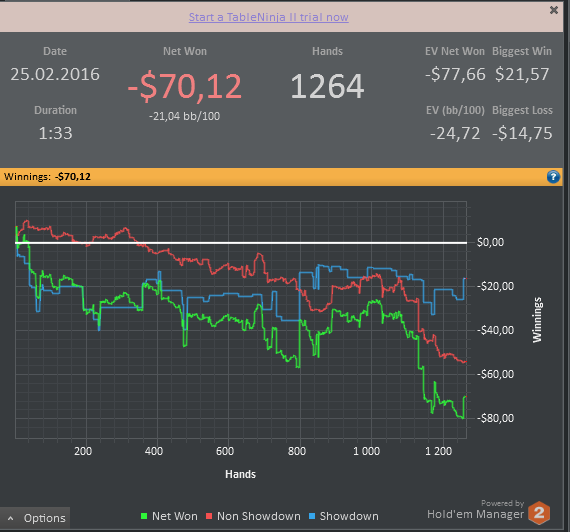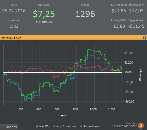 TsyhanouDzmitry, да я все понимаю, тоже в карты на деньги поигрываю :) просто за одну сессию такой разницы не было ни разу, завидно :) А вообще, у меня такая тактика - если ев больше, значит отлично, правильно делал, не повезло. Если денег больше ев, значит еще лучше, можно и мясца поесть в этом месяце :)