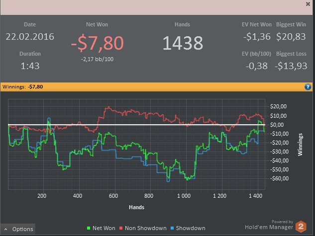 ещё она сессия не о чём , опять меня имел рег , который играет очень агрессивно против меня , на вскрытии у него всегда есть рука , а против моих блефов почти всегда получаю пуш , и это меня просто бесит , намного дешевле мне с ним вообще не играть , хотя ему может просто эту неделю против меня заходит