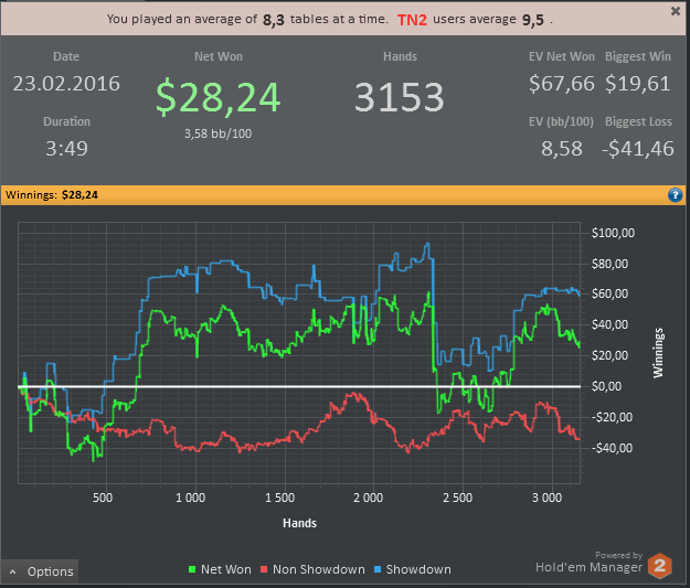 поиграл немного МСС , выходил из за столов когда удвоился или когда 60ББ в стеке было , в целом довольно интересоваться сессия получилась , не надо было всё время за стеками смотреть (а то иногда играю мих МСС\Бсс, и надо внимательно следить за стеками ) , старался агрессивно регов 3бетить . В целом мне хорошо заходило и доезжало , хотя и ошибок я больших не заметил ,непример мои две пары переехали стрит с флопа , монеток я много затащил , поэтому и по ЕВ так мало выиграл .Сегодня ещё буду играть сателит за 55$ на турнир за 1к$